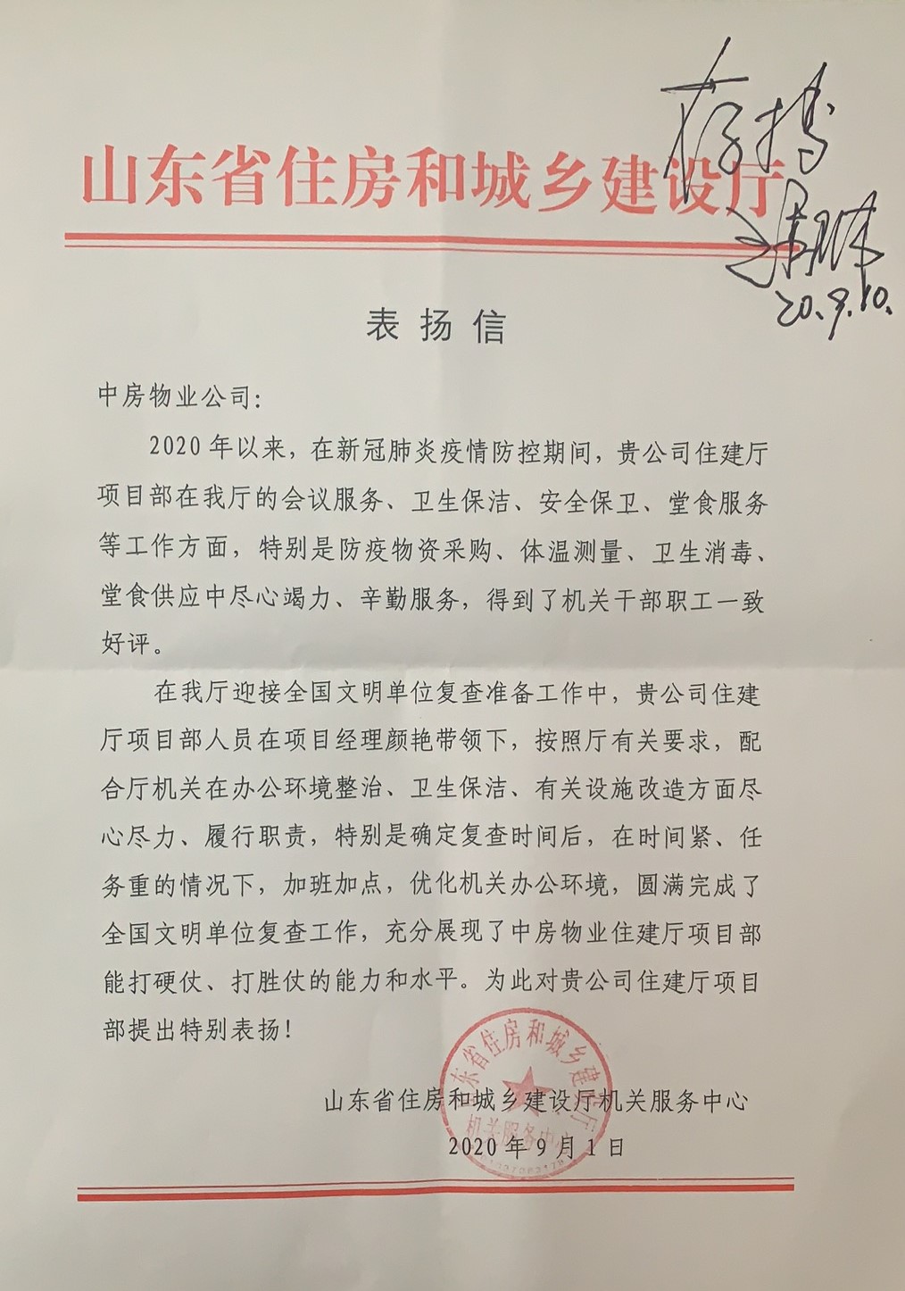 在新冠肺炎防控期間,省住建廳物業處全體員工在工作中盡心竭力、辛勤服務,得到廳機關干部職工的一致好評;近期,在廳機關迎接全國文明單位復查工作中,物業處全體員工在時間緊、任務重的情況下,加班加點,優化機關...